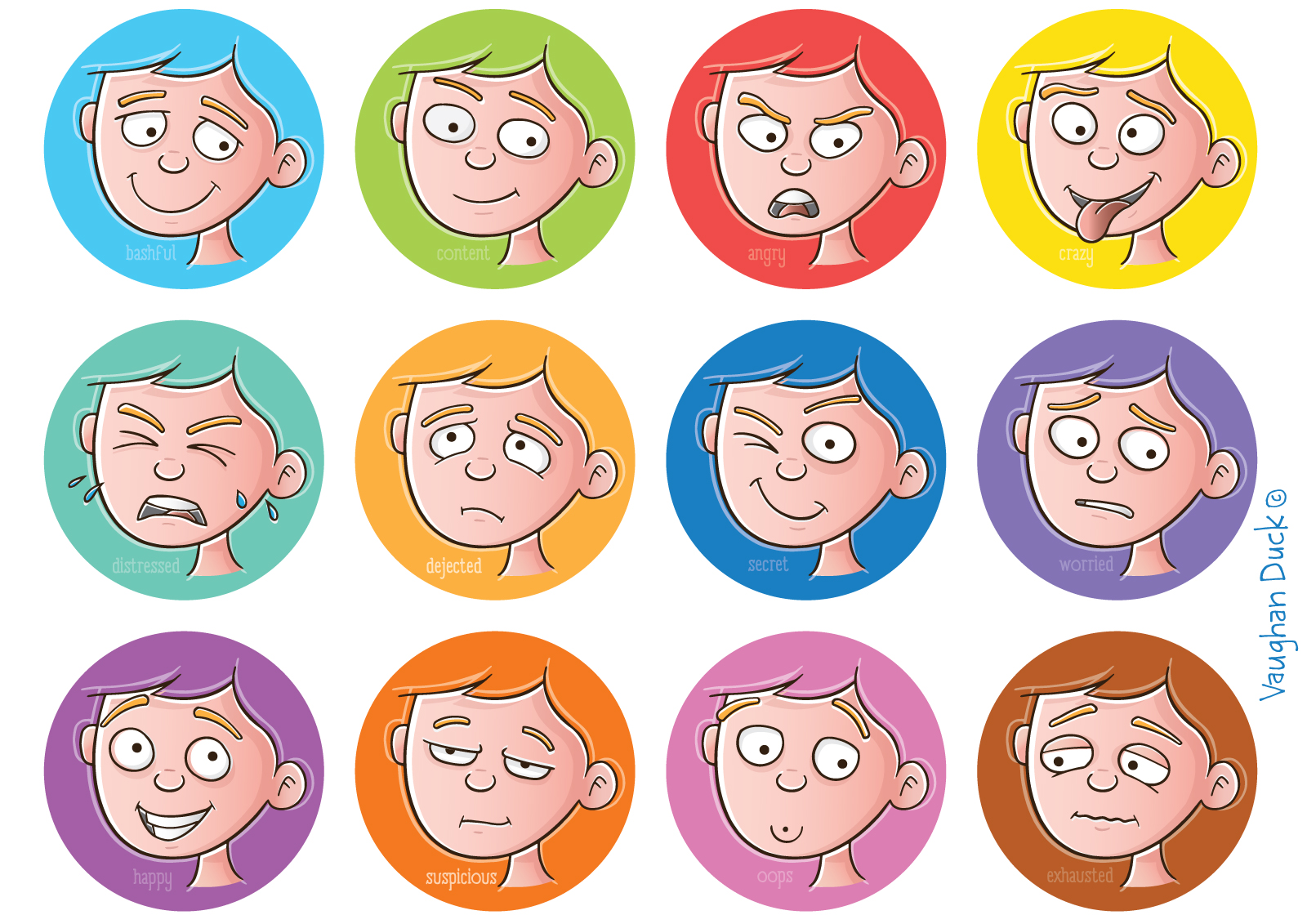 Emotions, Facial Expressions, Bashful, Content, Angry, Crazy, Distressed, Dejected, Secret, Worried, Happy, Suspicious, Oops, Exhausted, Kids Faces